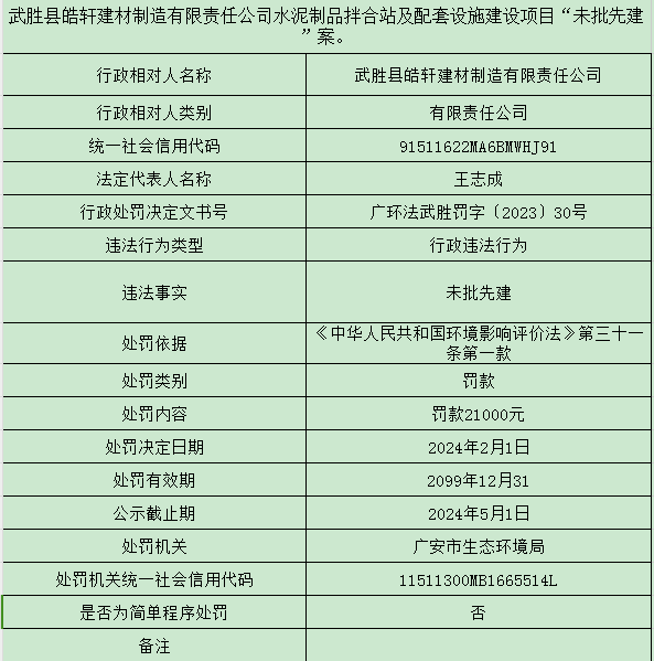 广安市武胜生态环境局行政处罚公示(武胜县皓轩建材制造有限责任公司水泥制品拌合站及配套设施建设项目“未批先建”案。)