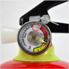 6.看压力指示器。贮压式灭火器应装压力指示器(二氧化碳灭火器除外),压力指示器的指针应指示在绿色区域范围内。压力指示器的种类应与该灭火器的种类相符(表盘上应有字母:干粉灭火剂为“F”;水基型灭火剂为“S”;洁净气体灭火剂为“J”)。