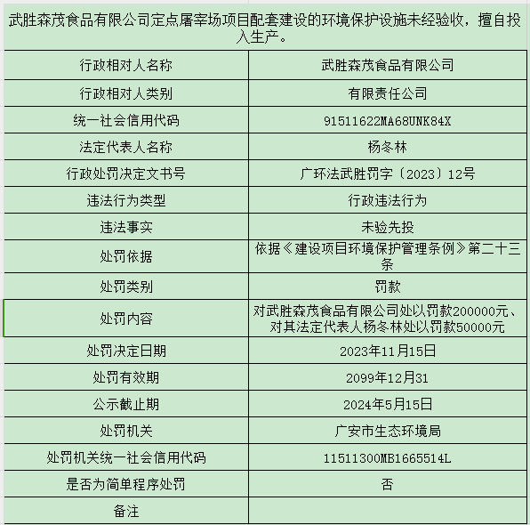 武胜森茂食品有限公司定点屠宰场项目配套建设的环境保护设施未经验收,擅自投入生产案