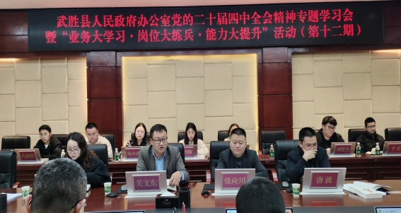 为深入学习贯彻党的二十届四中全会精神,切实提高县政府办全体干部职工政务信息写作水平,11月20日晚,武胜县人民政府办公室举办党的二十届四中全会精神专题学习会暨“业务大学习·岗位大练兵·能力大提升”培训班第十二期。县政府办科级领导干部、各股室工作人员参加培训,会议严格落实考勤与会风督查要求,确保学习培训取得实效。